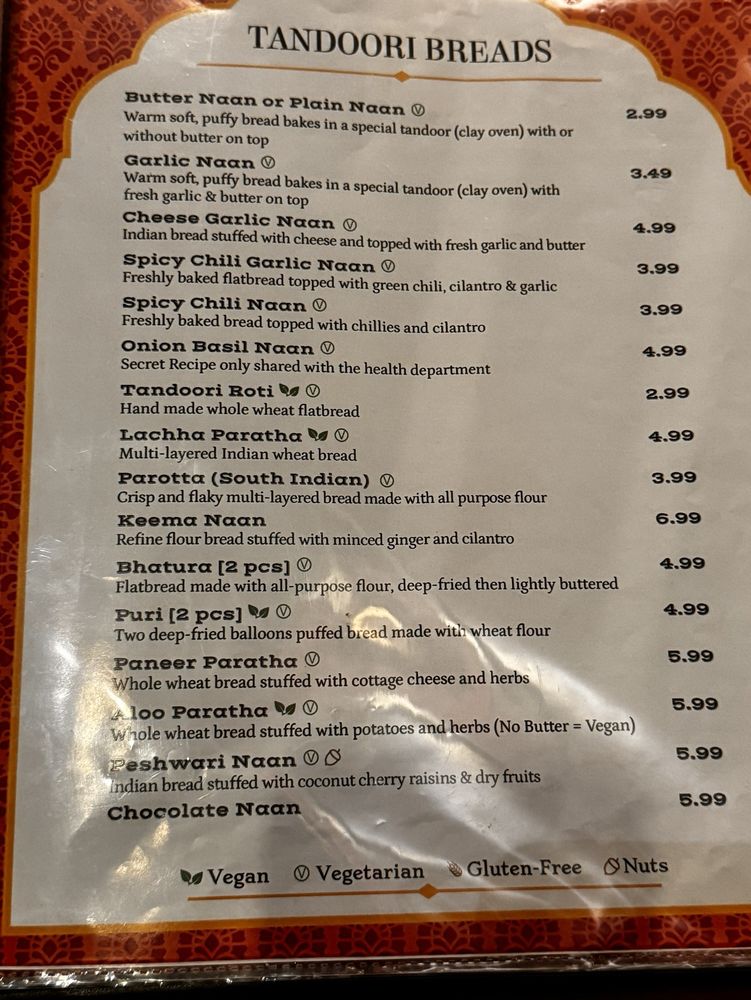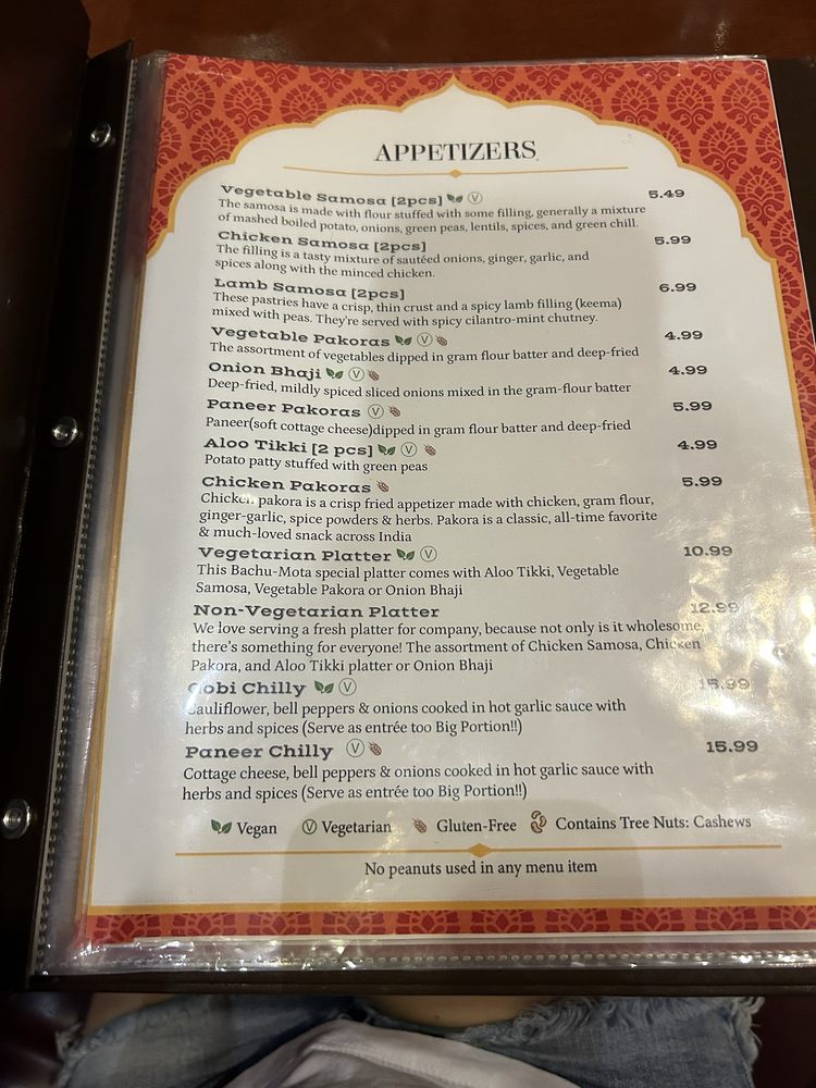 This bachu-mota special platter comes with aloo tikki, vegetable samosa, vegetable pakora or onion bhaji. Add-on paneer pakora for an additional charge. Vegan. Vegetarian.