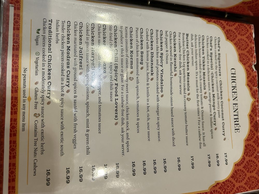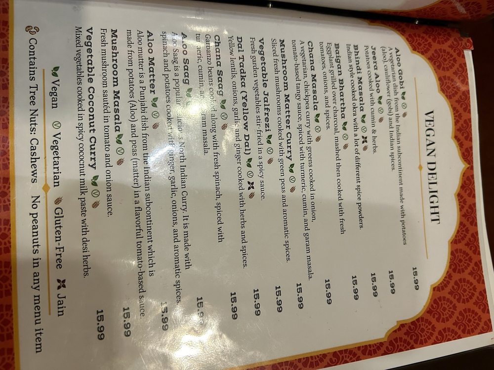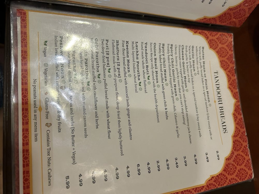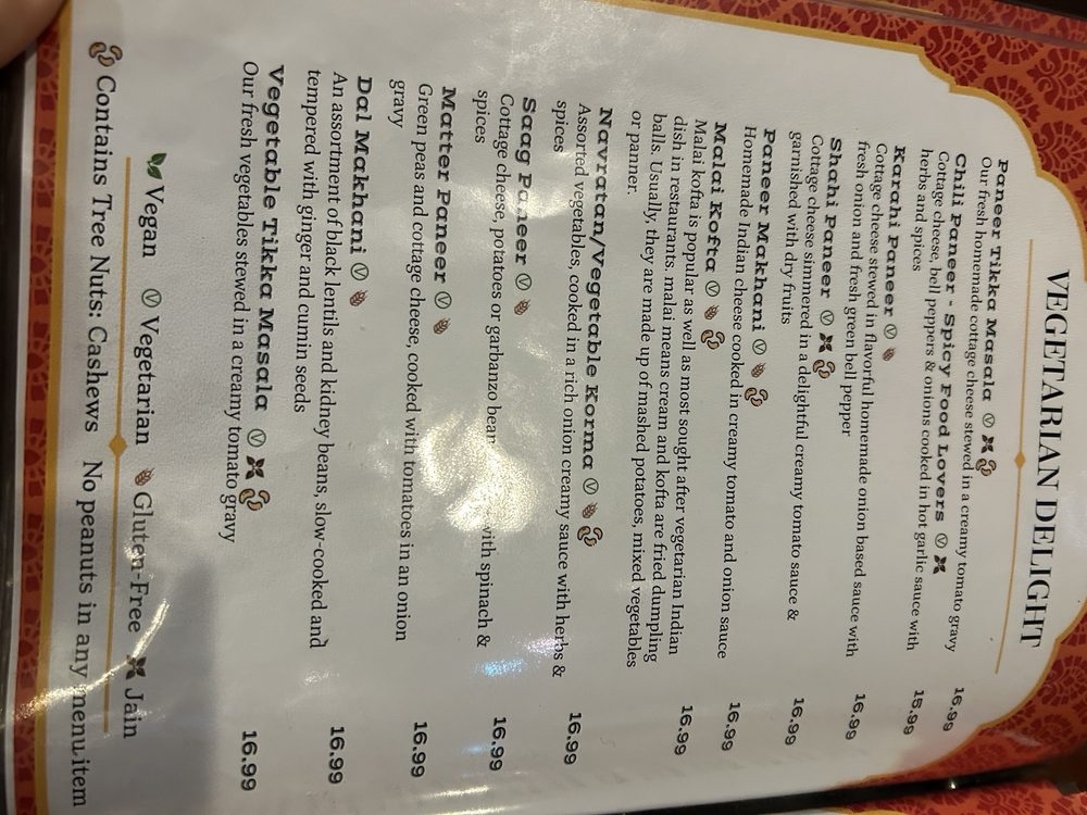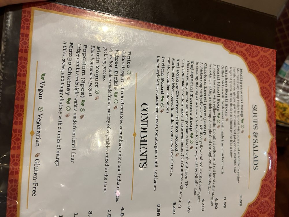 Introducing the menu at Taj Palace, an Indian Halal restaurant in Las Vegas, offers a diverse range of appetizers, tandoori bread, and chicken entrees. The Vegetable Samosa, Chicken Tikka Masala, and Butter Naan are standout dishes praised by customers. The menu caters to various dietary preferences with options like Vegan and Gluten-free. The atmosphere is described as casual, with attentive service and a good selection of beverages. Taj Palace also offers catering services, making it a great choice for group gatherings. With positive reviews from customers praising the flavorful dishes and friendly staff, Taj Palace stands out as a must-visit for authentic Indian cuisine enthusiasts.