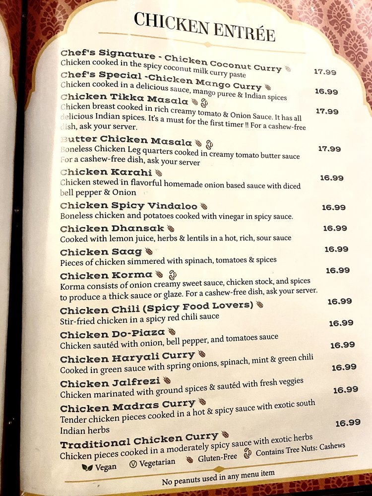 Korma consists of onion creamy sweet sauce, chicken stock, and spices to produce a thick sauce or glaze. Gluten-free. Nuts.